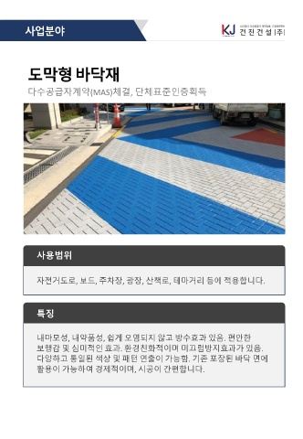 사 업 분 야 도 막 형 바 닥 재 다수공급자계약(MAS)체결, 단체표준인증획득 사용범위 자전거도로, 보드, 주차장, 광장, 산책로, 테마거리 등에 적용합니다. 특징 내마모성, 내약품성, 쉽게 오염되지 않고 방수효과 있음. 편안한 보행감 및 심미적인 효과. 환경친화적이며 미끄럼방지효과가 있음. 다양하고 통일된 색상 및 패턴 연출이 가능함. 기존 포장된 바닥 면에 활용이 가능하여 경제적이며, 시공이 간편합니다.