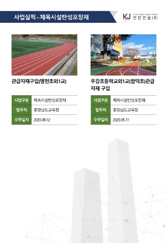 체 사 업 실 적 – 육 시 설 탄 성 포 장 재 관 급 자 재 구 입 (명 천 초 외 1교) 우 강 초 등 학 교 외 1교(합 덕 초 )관 급 자 재 구 입 사 업 구 분 체 육 시 설 탄 성 포 장 재 사 업 구 분 체 육 시 설 탄 성 포 장 재 발 주 처 충 청 남 도 교 육 청 발 주 처 충 청 남 도 교 육 청 수 주 일 자 2020-08-12 수 주 일 자 2020-05-11
